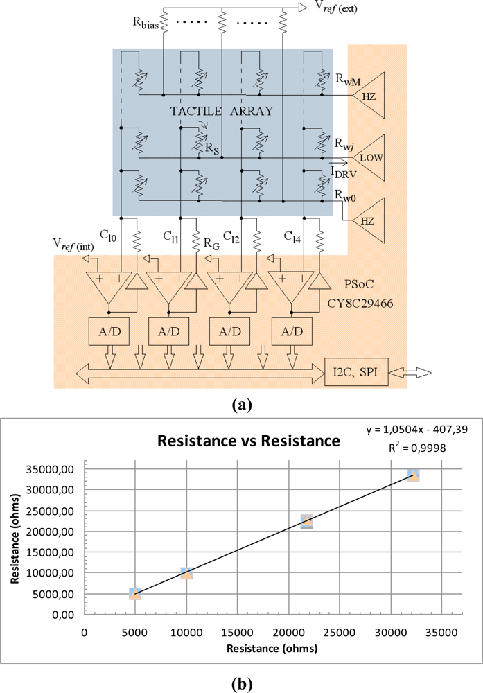 Another test was carried out to examine the performance of the implemented circuits in the crosstalk cancelation. A resistor of high value was surrounded by resistors of low value in an array with shared tracks to address rows and columns that model a tactile sensor. This was considered preferable to making it with a tactile sensor to isolate crosstalk caused by electrical and mechanical sources. Crosstalk was not observed in any case, it was smaller than a Least Significant Bit. However, crosstalk was very significant if the electronics in Figure 1(a) was used instead of the others.
