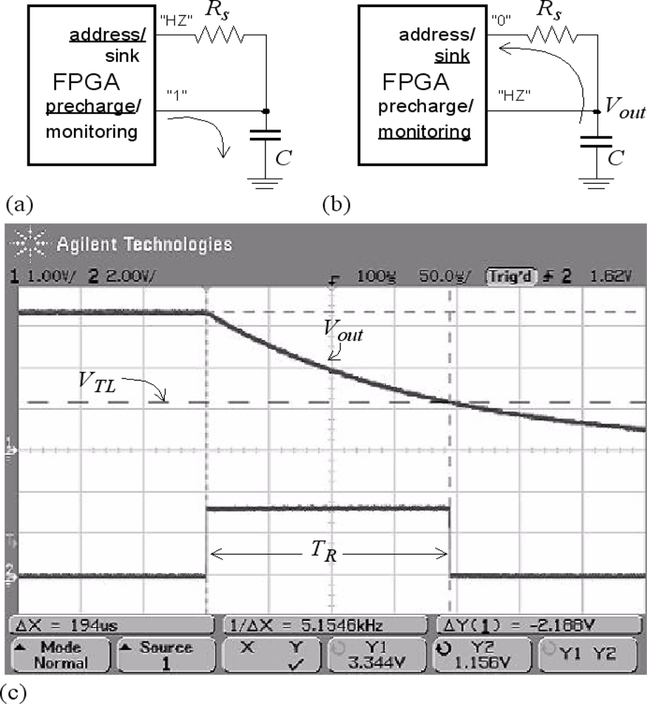 The following procedure describes how to connect a resistive sensor to a device with digital interface, i.e., a device designed to interface with digital signals. A thorough study of this strategy for resistive sensor-to-microcontroller interfaces is reported in [13]. The approach is illustrated in Figure 4. In a first phase the capacitor is charged through the pin named “precharge/monitoring” at Figure 4(a). In the second phase it is discharged. To do that, the pin “address/sink” at Figure 4 is set to a digital low value and it sinks the current from the capacitor. A timer starts its count at this instant, and the voltage across the capacitor is monitored by the input with label “precharge/monitoring” at Figure 4(b). When it takes a value VTL corresponding to a digital “0”, the count stops. The measured time is: