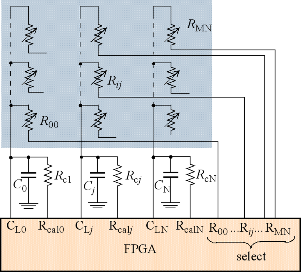To obtain the resistance Rij from Equation (4) we have to know the values of C, VDD and VTL. However, we ignore their exact value, and they can drift with time, power voltage supply or temperature. A calibration procedure can be implemented to compensate such lack of knowledge and/or interferences. The simplest consists in using calibration resistors, like those labeled Rc1,...Rcj...RcN at Figure 5. The whole set of calibration resistors is read as a row of the tactile array. Then the resistance after calibration is computed as:
