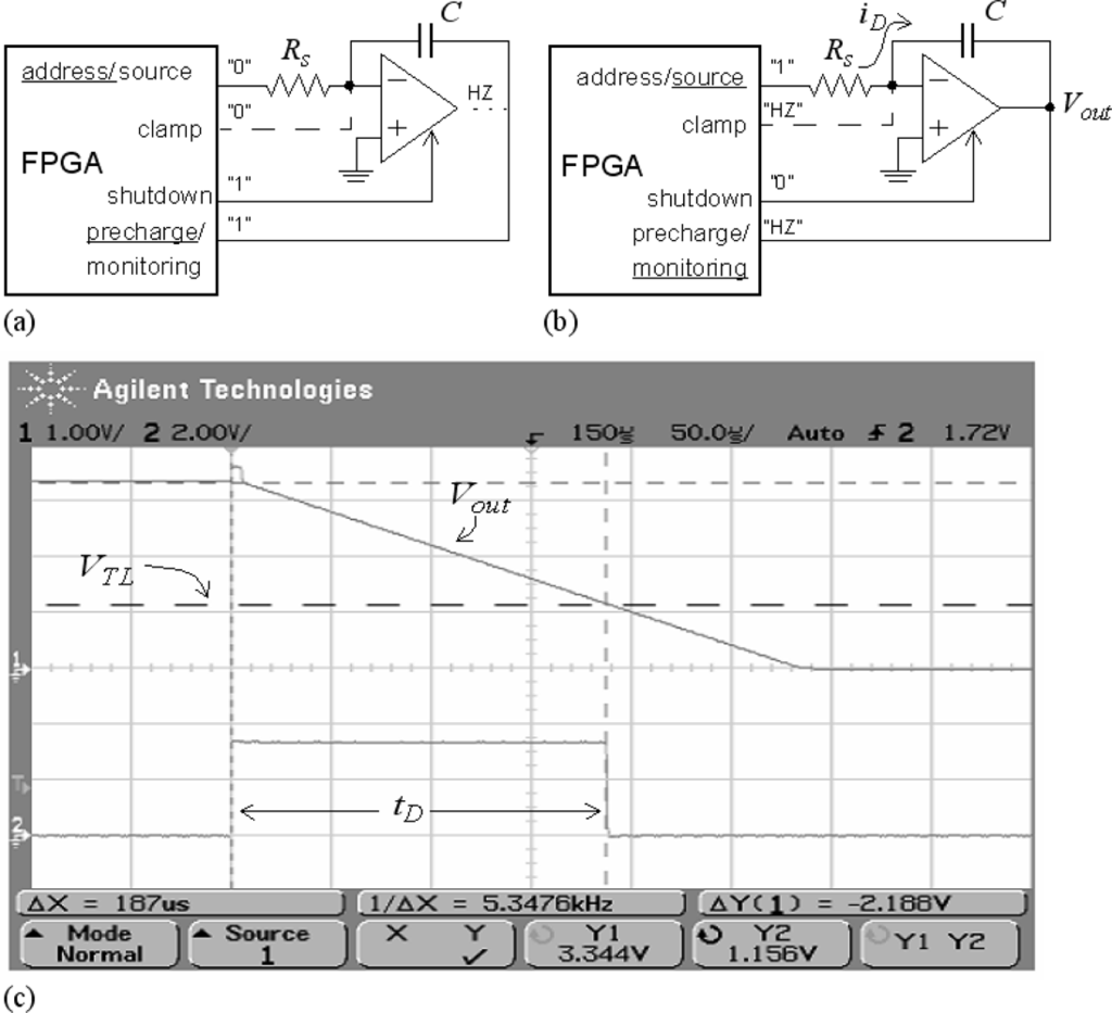 If the tactile array has a high number of tactels, the strategy in Figure 5 is not feasible. For instance, up to 288 pins are required to implement the interface with an array of 16 × 16 tactels. We propose the use of active instead of passive integrators to implement the direct connection for this case. Figure 6 shows the implementation for a single resistive sensor. The concept is the same as for the use of passive integrators, in Figure 6(a) the capacitor is charged, and it is discharged in Figure 6(b) with a constant current given by iD = VDD/RS (note the linear discharge at Figure 6(c)). Nevertheless, there are some differences. First, we need to ‘turn off’ the operational amplifier in the charging phase of the capacitor because otherwise its output interferes in the charging and it is not completed. So we need an amplifier with ‘shutdown’ input and a dedicated pin of the FPGA to address it. Second, another output of the FPGA is devoted to clamp the non inverting input of the amplifier to a voltage close to ground in the charging phase. The charge would be completed without this clamp but the time to charge the capacitor would depend on the value of the resistor. Therefore, to reduce the time for the analog to digital conversion the use of this clamp is recommended. However, it can be removed in the case of low dynamic requirements to reduce the number of pins of the FPGA dedicated to the analog to digital conversion.