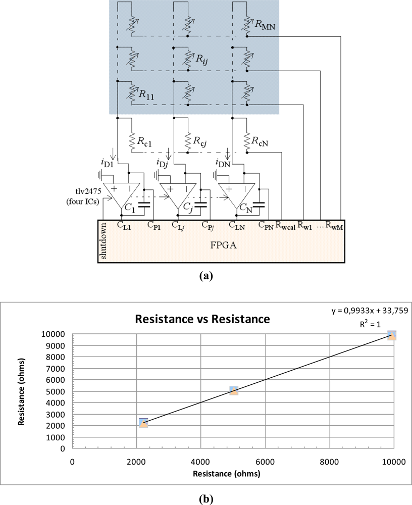 Note that a high current flows now from pin Rwi. A current up to 24 mA can be sourced by these pins for the device of the prototype of this paper. This current is sunk by the output of the Op-Amp, so it must be chosen to accomplish this. Note also that its output must be rail to rail if the supply voltage is the same as for the FPGA. The TLV2475 (Texas Instruments) is able to sink 10 mA at 180 mV off the rail. The limit of 24 mA in sourcing current from the pins that select the active row imposes the lower limit of the resistance that can be measured which is Rijmin = N × VDD/24 mA. For a target ENOB the upper limit in the range of the resistances that can be measured is derived from Equation (8). Note that there is a tradeoff here with the conversion time since the larger the value of Rij is, the larger the discharging time tDj in Equation (7). It is possible to reduce the discharging time while preserving the resolution given by Equation (8) if a smaller capacitance is chosen for Cj (note that the result of Equation (8) is the same because ΔRij has increased). Nevertheless, the time constant is reduced in this way for small resistor values and the approximation of neglecting the trigger noise is less valid. Figure 7(b) shows the result of measuring a few resistors with the electronics in Figure 7(a) versus the data from a multimeter. The data was obtained by fCLK = 50 MHz, Cj = 50 nF, Rijmin = 2.2 KΩ and Rijmax = 9.927 KΩ. The time invested to scan the 16 × 16 array is 5.5 ms. The standard deviation for the resistor of 2.2 KΩ is 1.18 Ω, so the approximation of neglecting the trigger noise is valid.