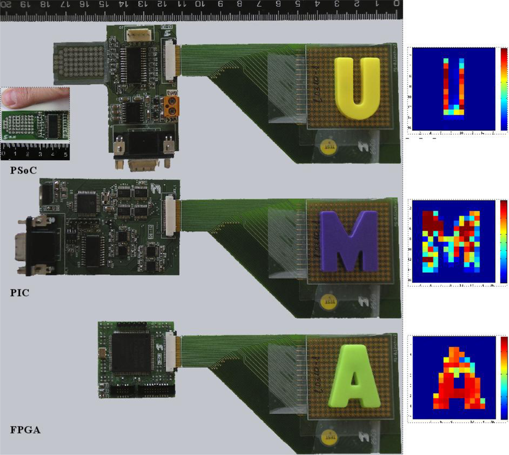 Figure 8 shows photographs of prototypes of electronics based on Microcontroller, PSoC and FPGA. They are connected to the same piezoresistive tactile sensor [20], although the PSoC is not able to scan the whole array (the detail in the figure corresponding to the PSoC shows an implementation where the PSoC is the only IC on the PCB and the electrodes are arranged to resemble the shape of a fingertip). The output of these sensors for different letter-shaped profiles on them is shown on the left of Figure 8. Moreover, Table 1 presents results obtained with these electronics, where the transceivers are not counted in the number of ICs required. As mentioned in the introduction, the comparison should be made with care because different alternatives could be followed in every case. Nevertheless, it provides interesting information for hardware designers.