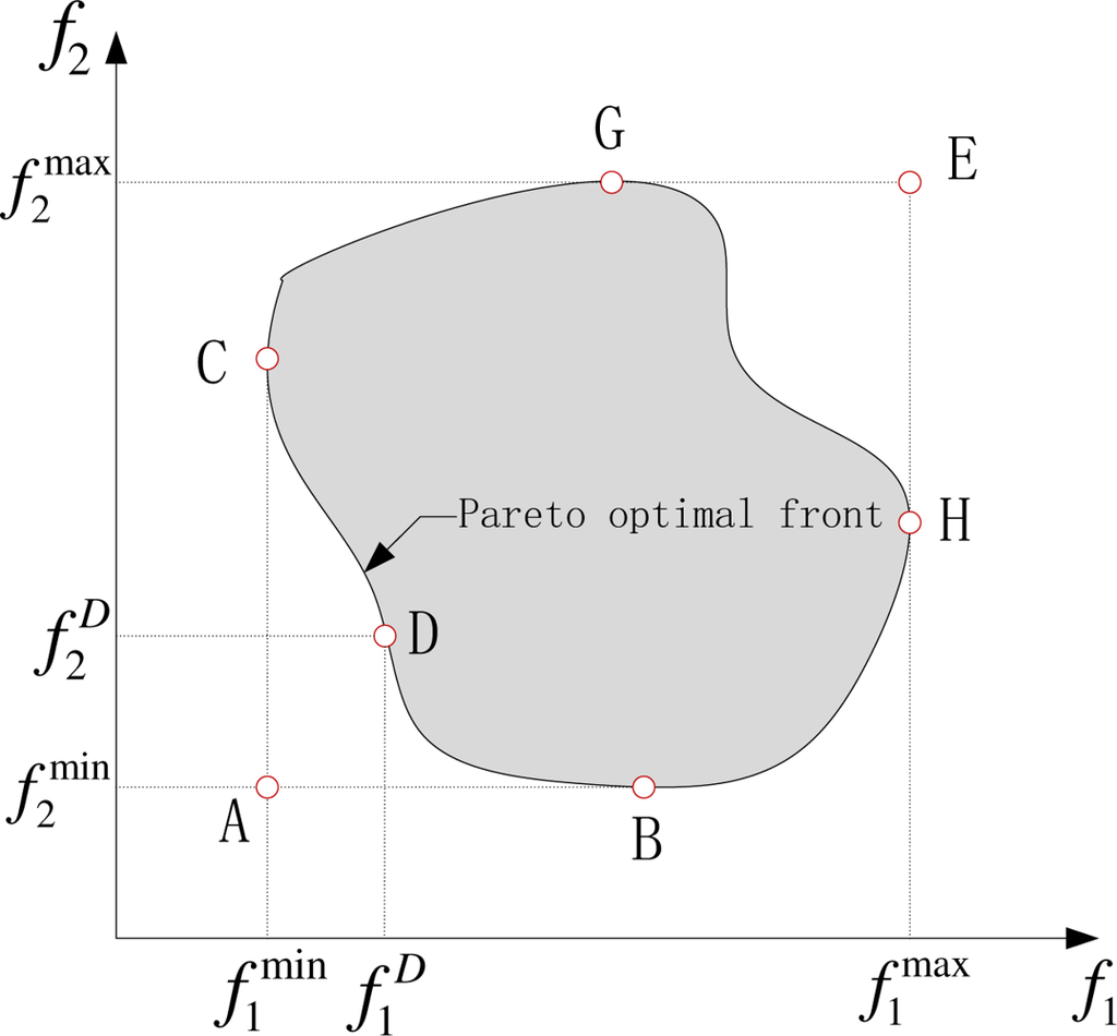 Conventional multi-objective control methods always select the optimal value of each performance as the point control objective and minimize the deviation of each performance. However, it is very difficult to achieve the multiple objectives’ precise points simultaneously due to the conflicts between them. For example, given a two-objective conflict control problem in Figure 1, we always desire obtaining the minimal point A of the two objectives f1 and f2 simultaneously. In reality, the feasible region with control solutions existing is the shaded area. This happens to other multi-objective conflict control problems, so it is utopian and impractical for multi-objective conflict control problems to adopt the method of the precise point control in practical applications.