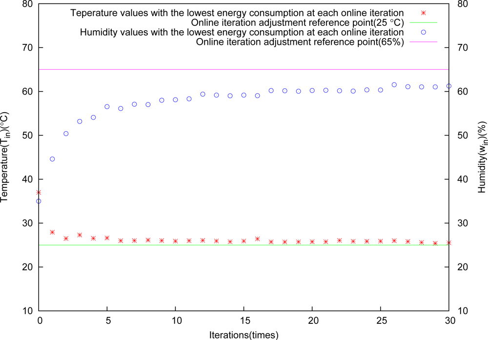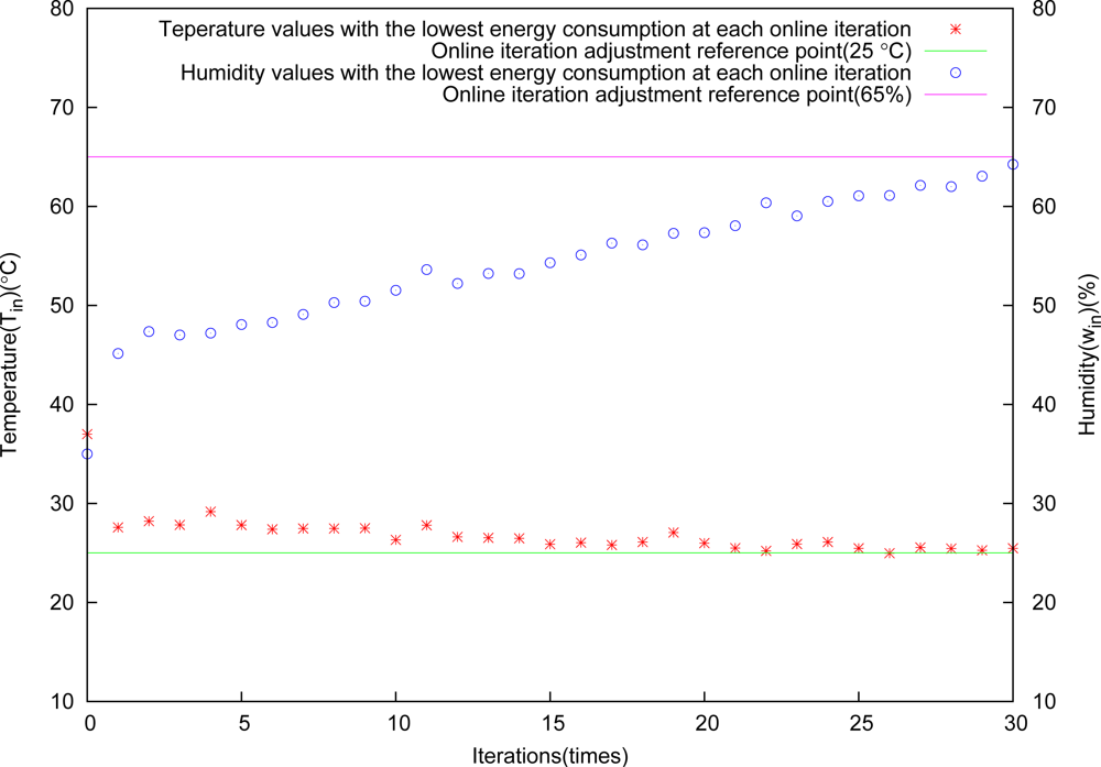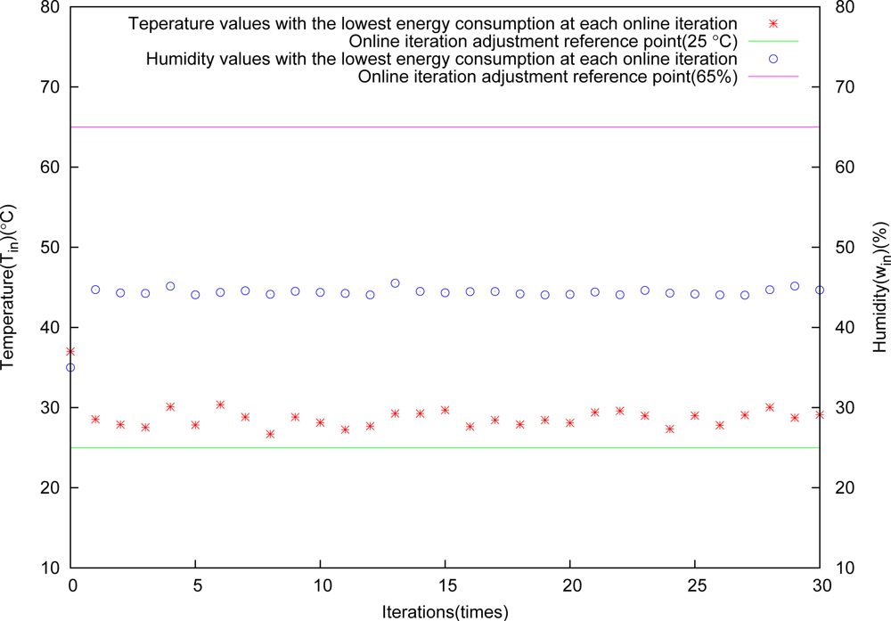 Temperature and humidity versus iterations almost appear linear, and they are in good agreement with the arithmetic sequence adjustment for the control deviation tolerance Δx at each iteration. Figure 9 shows the relation between objective control points and energy consumption, and the higher control precision, the more energy consumption, because they are conflicting with each other.
