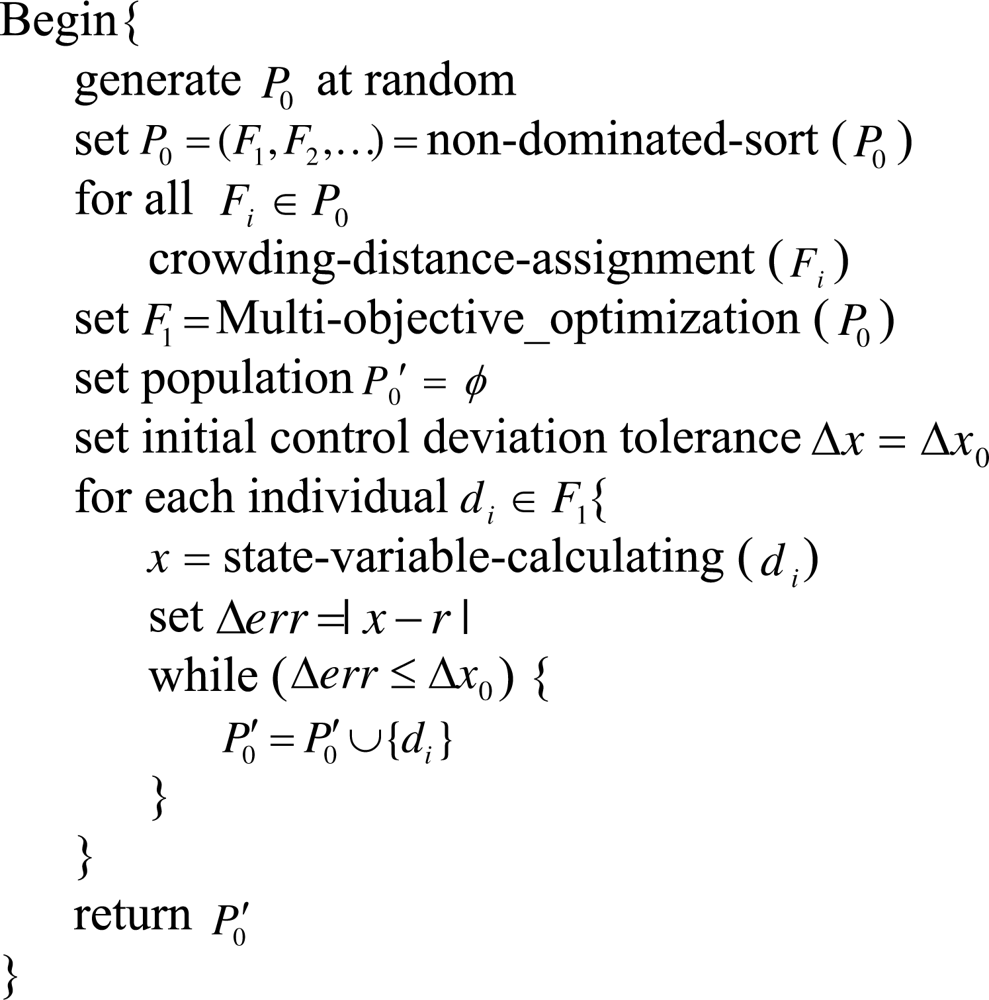 In this section, we describe the compatible optimization level, in which the state variables (i.e., indoor temperature and humidity) are incorporated into the algorithm. Firstly, some parameters are initialized and the initial population is generated by some traditional methods. Then the multi-objective optimizer is called for Pareto optimal front search, and finally the obtained population P′0 with solutions of the front F1, within the initial control deviation tolerance Δx0, is selected as the initial population of the compatible control level. The pseudo code of the compatible optimization level is shown in Figure 5.