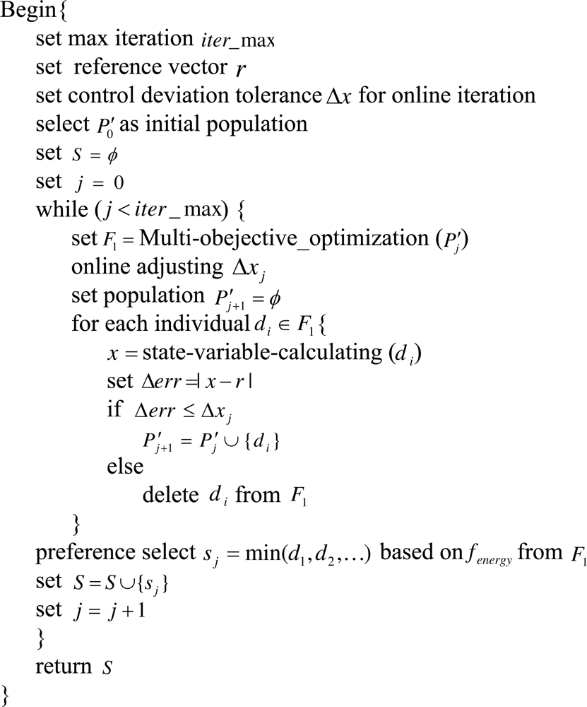 From the above compatible optimization level algorithm, we can obtain the required initial population P′0 within control deviation tolerance. Based on the objectives of high control precision and as low energy consumption as possible, we can achieve a series of Pareto optimal solution sets of control inputs by calling the Multi-objective optimizer. Then, the indoor temperature (Tin) and humidity (win) are regulated within the compatible objective regions by using the online iterative and adjustment method. Finally, we select the solution with the lowest energy consumption from the obtained front F1 at each iteration. The pseudo code of this approach is given in Figure 6.