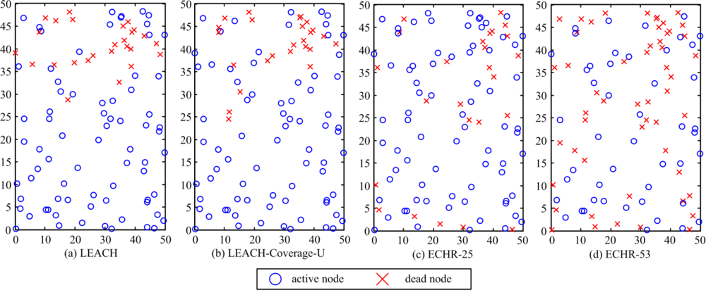 Comparing with Figure 11(a), the active nodes in Figure 11(b) are more dispersed because the locations of nodes are taken into account by the LEACH-Coverage-U protocol. However, the majority of dead nodes are still located at the upper side. Figure 11(c) shows the distribution of active and dead nodes when the number of dead node is equal to 25, obtained by applying the proposed ECHR protocol to the network. Because the ECHR protocol is able to manage the network with features of energy-balancing and coverage-preserving, the locations of dead nodes are more evenly distributed over the network, which can effectively prevent coverage holes from occurring. Furthermore, Figure 11(d) depicts the distributions of nodes before the network fails to maintain 100% sensing coverage. In this case, the dead nodes are equal to 53. The experiment results demonstrate that using the overlapped sensing ranges the proposed ECHR protocol utilizes the energy of the nodes more efficiently. Thus, the duration for maintaining full sensing coverage can be significantly prolonged.
