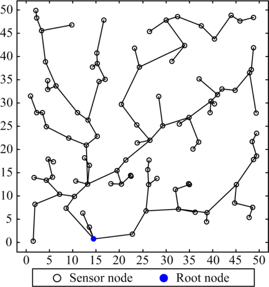 The proposed method is most suitable for circumstances in which losing any sensing data is not acceptable, e.g., WSN-based perimeter surveillance in battlefields or other high security areas [23]. According to this scenario, sensor nodes can be randomly deployed by helicopters or aircrafts [7]. They are then self-organized into a functional WSN for comprehensive and continuous perimeter surveillance. In addition, the proposed method is also suitable for the WSN-based smart healthcare that requires continuous and remote monitoring [24]. Here, we take the battlefield surveillance as an example; a network with 100 sensor nodes is randomly distributed over a battle area of 50 × 50 m2. The deployed nodes equipped with vibration sensors that can detect any object passing through the area within its sensing range. The sensing range r is set at 7.5 m. In addition, this battlefield consists of 2,500 POIs that are grid distributed. In each round live nodes need to report the sensed data to the BS, and the BS is located at the coordinate (25, −50). In order to prevent long distance transmissions and to reduce power dissipation in data transmission, a suitable communication range Cr is chosen to make the average hop-count of nodes equal to 7.5. The initial energy of all nodes is assumed to be 1 joule, and the nodes cannot be recharged. Furthermore, the parameters of the radio model are summarized in Table 1, which are the same as those adopted by [18] in order to perform fair comparisons between the proposed method and the previous studies. The path loss of the radio model is set the same as the previous studies [11,18], in which γ is 2 for data transmissions between nodes in a free-space. We specifically set γ to 2.5 for the long range data transmissions from the root node to the BS [25]. The compression coefficient μ of Equation (12) is set at 0.05. In this study, each node should have some specific data which is different than other nodes, and the setting of compression coefficient μ set at 0.05 is much suitable in the real-world works. Hence, the compression coefficient μ is set at 0.05 in this work to evaluate the ECHR performance. Simulation results are obtained by averaging those obtained from 100 network topologies.
