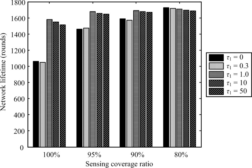 Figure 5 shows the coverage-lifetime comparison under varying τ1 when set τ2 is set at 3.1. The coverage-lifetime demonstrated in Figure 5 is the network lifetime when 100%, 95%, 90%, and 80% of network coverage is preserved, respectively. When τ1 = 1.0, the network lifetime can provide a full sensing coverage over other τ1 values. In this case, if the root node selection does not take the residue energy into account (i.e., τ1 = 0), the redundant nodes will always be chosen as the root node and their energy will run out fast. Under this circumstance, however, the data collected by active nodes needs to be transmitted for a long distance, because fewer intermediate nodes are used to transmit data. As a result, the active nodes run out of energy more quickly. On the contrary, the proposed root selection mechanism puts an emphasis more on energy-balancing than the coverage factor does when τ1 is set at a large value, say 50. Such a situation leads to a scenario that the redundant node might not be chosen as the root node, network lifetime with a full sensing coverage may not last longer.