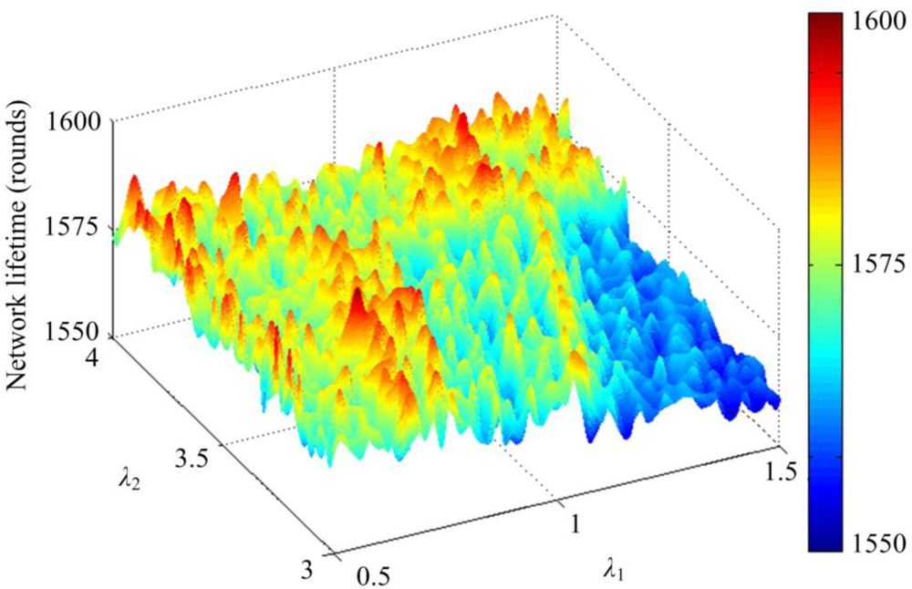 In addition, we analyze the effects of varying weighting coefficients of the distance factor, λ1, and the residual energy factor, λ2, of Equation (7) on the energy-aware hierarchical routing algorithm. Figure 7 shows three-dimensional plots of the network lifetime with a 100% sensing coverage versus λ1 and λ2, when τ1 = 1 and τ2 = 3.1. After an extensive series of simulations, the optimal value is located at the area where 0.5 ≤ λ1 ≤ 1.5 and 3.0 ≤ λ2 ≤ 4.0. Here, we find optimum weighting coefficients, λ1, equal to 0.7, and λ2, equal to 3.3, with the maximum network lifetime under a 100% sensing coverage ratio.