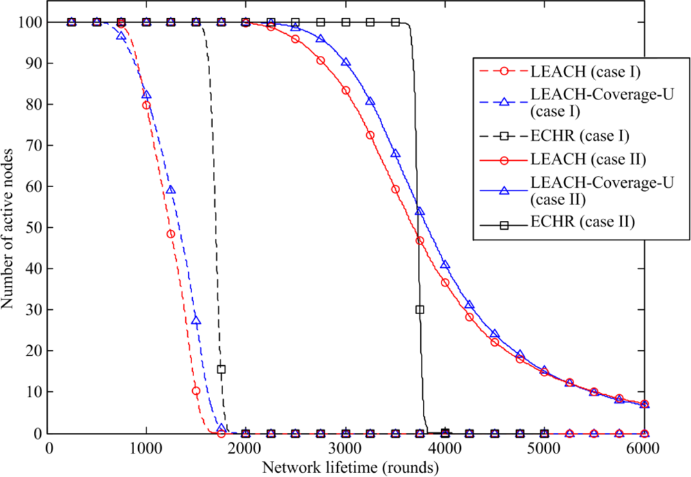 Figure 8 shows the number of active sensor nodes versus the simulation rounds. In the case I, the LEACH and the LEACH-Coverage-U protocols lose their first node around the 600th round. The proposed ECHR protocol is able to maintain all sensor nodes alive till the 1,500th round, which is approximately 2.5 times longer than those generated by the LEACH and the LEACH-Coverage-U protocols. Moreover, the lifetime of first node that runs out of its energy using the proposed ECHR protocol is longer than those using the LEACH and the LEACH-Coverage-U protocols in the case II. By contract, using the ECHR protocol, after the first node runs out of energy, the number of the active nodes sharply falls. This is because the proposed ECHR protocol is able to equalize the energy consumption over the entire network. Furthermore, by maintaining nodes surviving longer time when relaying data, the energy consumed in transmission can be significantly reduced. Hence, using the proposed ECHR protocol guarantees the WSN with high coverage precedence when applying the WSN to specific mission-critical areas, such as military surveillance and e-health care.