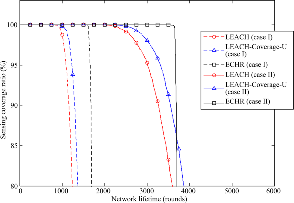 Figure 9 depicts the coverage ratio versus the simulation rounds. The proposed ECHR protocol performs relatively well when comparing to the LEACH and the LEACH-Coverage-U protocols. In the case I, for example the ECHR protocol maintains 100% coverage ratio until the 1,590th round, but the coverage ratios of LEACH protocol and the LEACH-Coverage-U protocol drop from 100% at the 802th and the 856th round, respectively. In other words, compared to the LEACH and the LEACH-Coverage-U protocols, the proposed ECHR protocol provides 98.3% and 85.7% increase in service time with a 100% sensing coverage ratio. The ECHR protocol also outperforms other protocols in the case II, and its network lifetime can be extended to nearly 1,250 rounds.