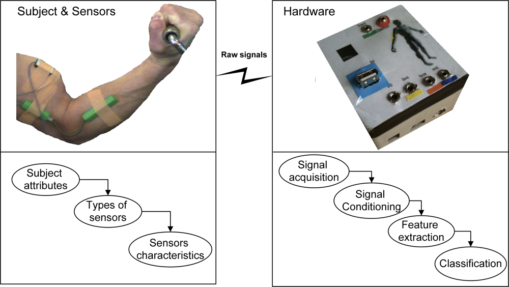 A typical experiment in muscle fatigue research involves a subject performing a set task such as moving a given limb in a specified manner while sensors attached to the skin detect changes in signals arising from the movement. The acquired signal is then recorded and post-processed to reveal the characteristics of the muscle during that particular exercise. Subjects are normally healthy volunteers who have had the experiment explained to them so that they are able to give informed consent, which is approved by an ethics committee to their participation in the research study. A schematic of a typical experimental set-up is given in Figure 1.