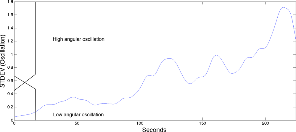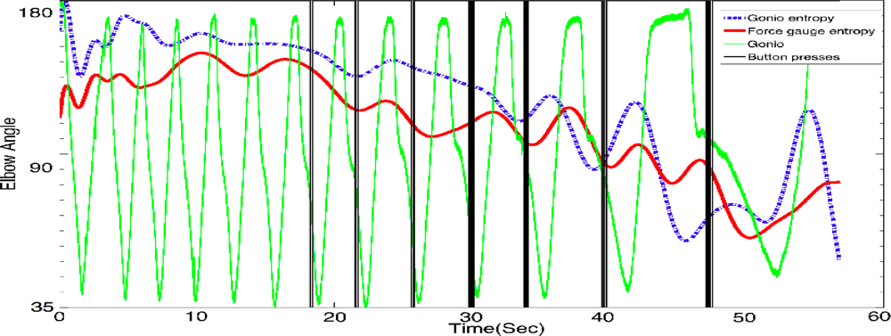 In previous research, Almulla et al. [7,33,34] labelled the sEMG signals using the recordings of the goniometer signal. This ensures that the sEMG classification in an autonomous system is correct, as the acquired sEMG signals is compared with the goniometer findings. To label the signals acquired from the subject into the three classes of fatigue (Non-Fatigue, Transition-to-Fatigue and Fatigue), Al-Mulla et al. used a fuzzy classifier (described in the classification section below) and the movement related aspects in a fatiguing contraction. For non-isometric contractions, the movement related aspects, such as speed of contractions, Moore-Garg Strain Index (button presses), elbow angle, arm vibration, force gauge, the entropy (function of probabilities in the signal) of elbow angle, and the entropy of force gauge, were considered as they are reliable indicators of fatigue in healthy subjects and in turn can correctly classify the sEMG signals [16–22]. The labelling was performed by human experts (a group composed of three experts concurring on the boundaries of the classes of fatigue) that used all the movement aspects of fatigue by referring to Table 1 as guide for labelling all the sEMG signals. Figure 2 shows, for illustration purposes, superimposed movement related signals for a single trial.