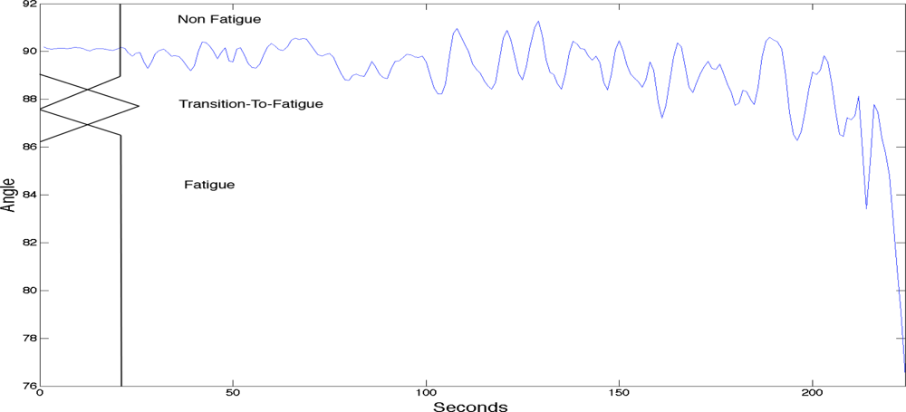 Current research tends to focus on two classes of localised muscle fatigue: Non-Fatigue and Fatigue. Fatigue relates to the onset of fatigue during a muscle contraction, while Non-Fatigue is the state of the muscle during the contraction that occurs before the onset of fatigue. However, Al-Mulla et al. [7] suggested an additional, third class of fatigue: Transition-to-Fatigue. Their research highlights that attempting to predict the onset of the Fatigue class at the time at which it occurs is insufficient since then the predictive nature of the measurement is inherently lost. Rather, once the onset of Transition-to-Fatigue is detected, what follows is a progressive process until fatigue onset. In the first stage of fatigue, Non-Fatigue, the fresh muscle is able to exert its maximum force. Once the fresh muscle starts to fatigue, new recruitment of muscle fibres occurs. This is usually manifested as the onset of Transition-to Fatigue, where there is a sudden increase in motor unit action potential (MAUP) firing rate. After this increase, a progression of this state (Transition-to-Fatigue) is observed until the onset of Fatigue. This can be detected as there is a drop in myoelectric power emanating from the muscle due to loss in conduction velocity (CV) within the localised muscle.