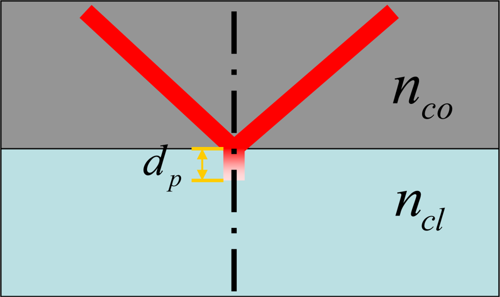 Optical fiber usually consists of a core and a cladding with different refractive indices. When light propagates, the main guided field is defined in the core, and the evanescent field is exponentially decayed in the cladding. After a distance of extension, the evanescent field decays to 1/e of its value at the core-cladding interface. As shown in Figure 1, this distance is defined as penetration depth, and it is mathematically described as: