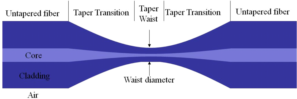 Tapered fiber is normally made by pulling the optical fiber when it is heated to its softening temperature to reduce the diameter to tens of micrometers. As a result, the tapered fiber consists of three contiguous parts: one taper waist segment with small and uniform diameter, and two conical transition regions with gradually changed diameter. The ends of conical transition regions are untapered fibers. A typical tapered fiber is shown in Figure 2. In reality, the fiber core material in the waist and transition regions do not have clear boundaries with the cladding material due to their mixing after heating.