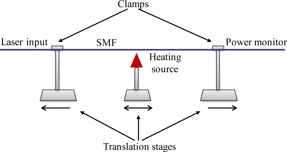 The parameters such as taper waist diameter, length, and transition shape, are critical for a specially required interference spectrum. By controlling the fabrication conditions such as pulling speed, heating length and temperature, tapered fiber with different shapes and properties can be fabricated. Figure 3 becomes a typical fabrication setup. Single-mode fibers (SMF) with core/cladding diameters of 8/125 μm were used. Its protective coating was removed over a section of about 15 mm long for heating. Two clamps were used to fix the SMF onto two translation stages (NRT 100, Thorlabs). A torch flame or CO2 laser was used as a heating source. A laser in a component test system (CTS) (Si 720, Micron Optics) excited one end of the fiber. The spectrum response from the other side of the fiber was monitored.