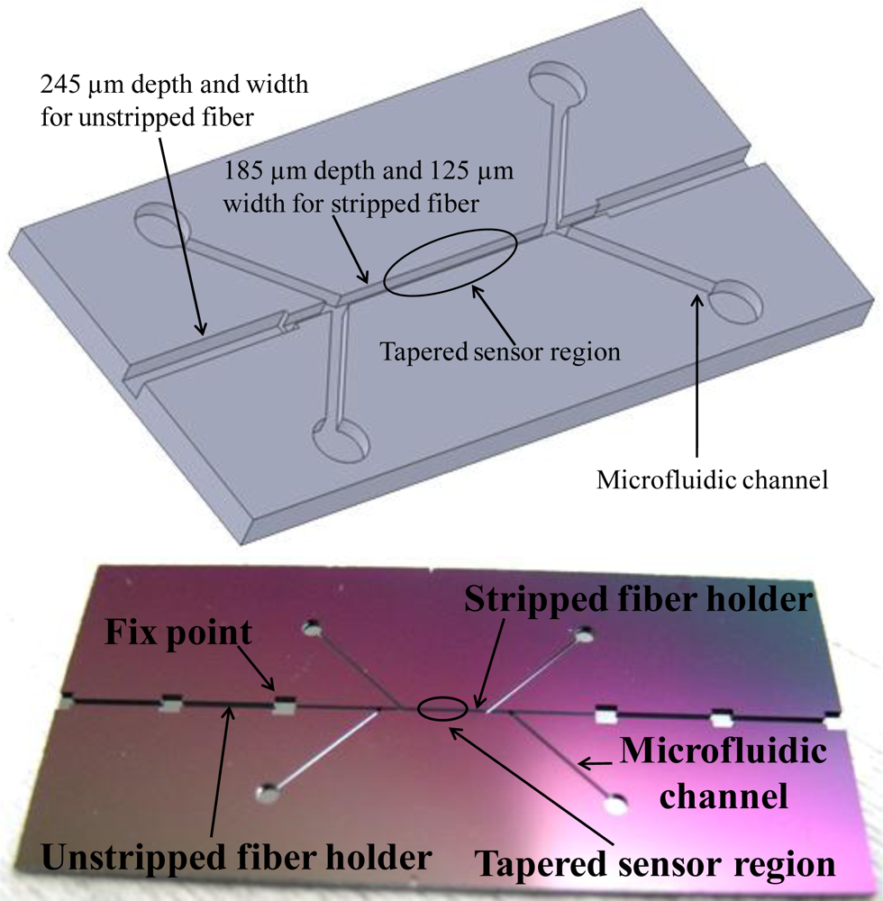 The tapered fiber sensor was thin and fragile after the fabrication. A microchannel chip was designed and fabricated for the sensor protection and further biotesting. The schematic of the microchannels on a silicon chip was shown in Figure 5(a).