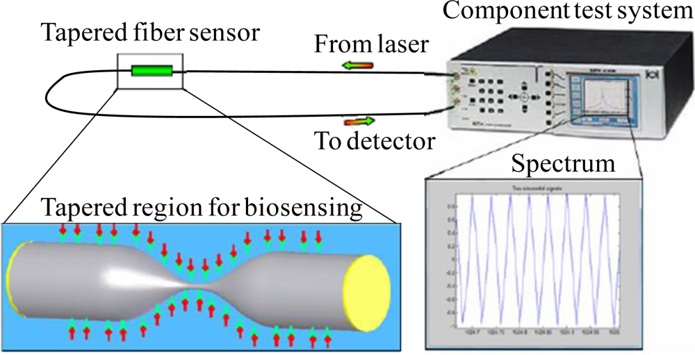 The biotest was set up as shown in Figure 6. The component test system was used to excite laser into one end of the tapered fiber sensor, and monitor the transmission spectrum from the other end. The bio-target bonding in the tapered region could be analyzed through the phase shifts of the spectrum.