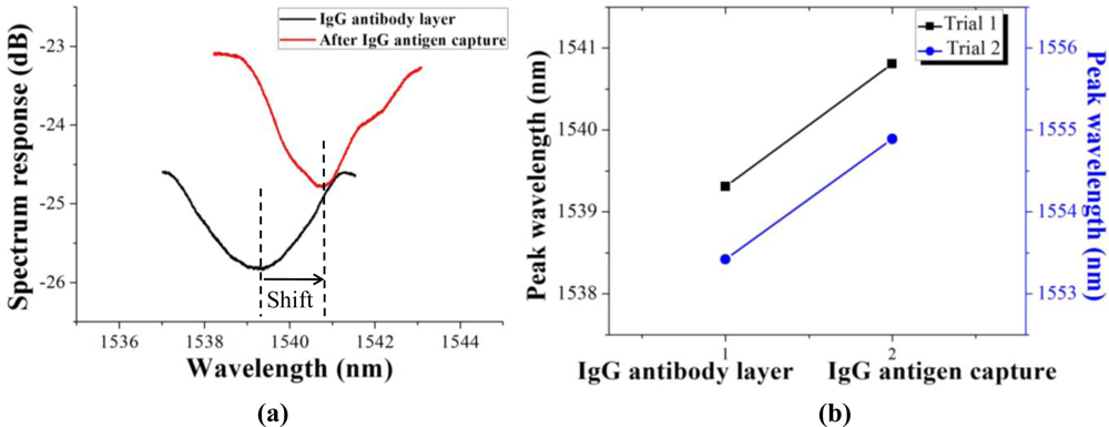 The comparison between the initial transmission spectrum (black) and IgG antibody-antigen pair layer (red) was shown in Figure 7(a). There was an obvious redshift of 1.50 nm after the capture of the IgG antigen. The reason of the small changes of profile and intensity in spectrum response will be analyzed after a comparison with the simulation results. As the repeatability test results shown in Figure 7(b), the captures of IgG antigen were successfully detected by demodulating the peak wavelength redshift of 1.50 nm and 1.47 nm, respectively, in two trials.