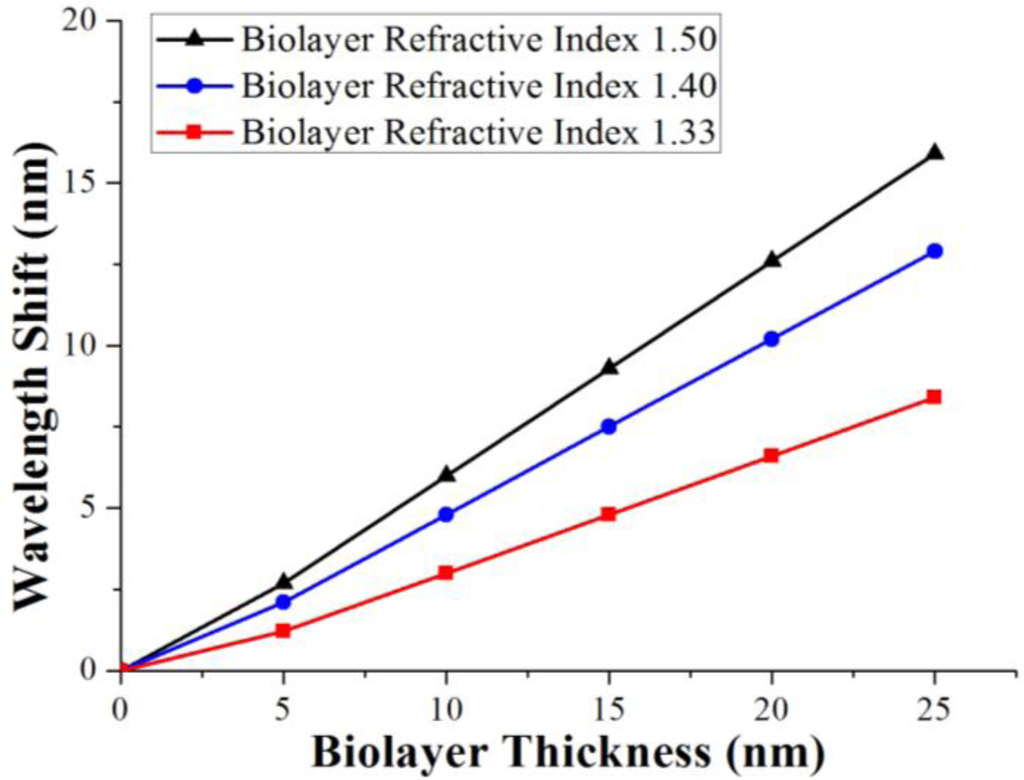 In general, the bonded biolayer should be in the nanometer range. To illustrate the potential to detect a very thin bio-layer, an optimized tapered fiber model with thinner and longer waist was used to calculate the influence of the presence of a thin biolayer at the taper waist. Figure 9 showed the phase shift with different biolayers’ thicknesses at the nanometer level. The conditions of three typical refractive indexes were given. Each of the three conditions has a linear wavelength shift response to the bonded biolayer thickness.