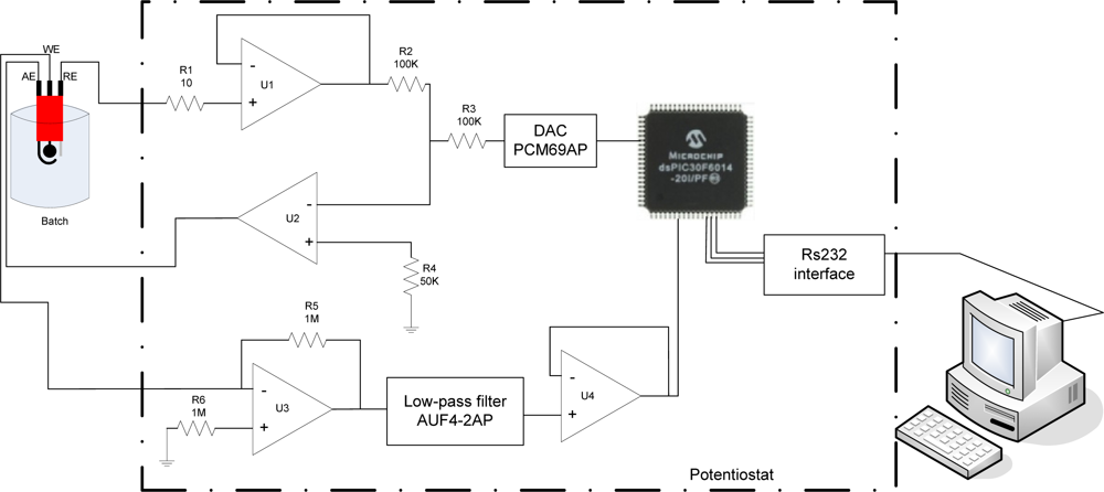 Figure 2 shows the circuit diagram of a portable potentiostat. The proposed potentiostat is mainly constructed by a dsPIC30F6014 microcontroller, a digital/analog converter, a current to voltage converter, an inverter amplifier, one low-pass active filter and a RS232 serial data hardware interface.