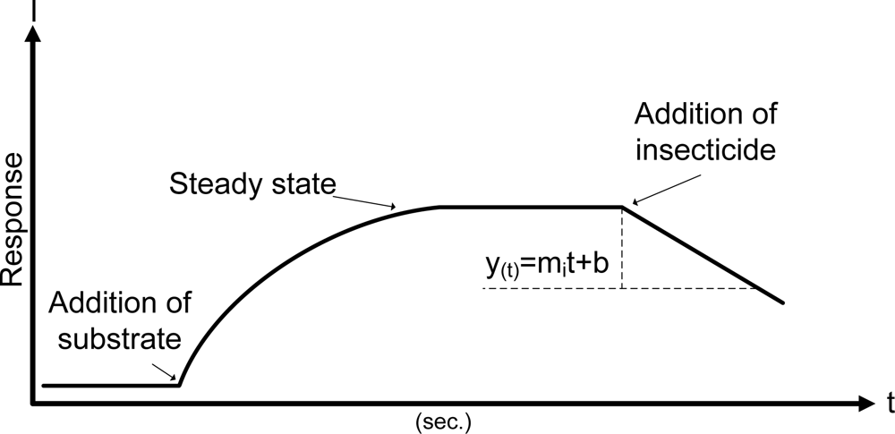 The concentration of insecticide is correlated with the value of slope measured. The protocol presented in this work is classified as a single step, according with Arduini et al. [28]. The analysis of the inhibition data was computed 2.5 min after of injection of pesticide, with an acquisition rate of 1 sample/s. 150 points per assay were analyzed.