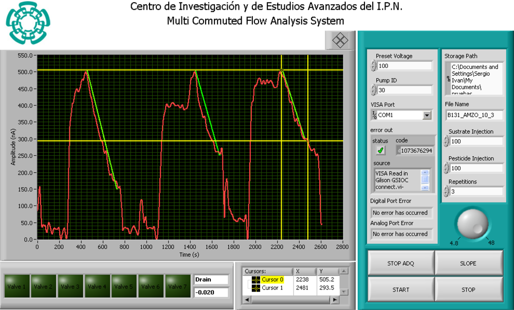The front panel is shown in Figure 4. The first right side section controls the physical hardware in the MCFA manifold (pump, valves and acquisition); the indicators show the status of every device and alert of any undesirable behavior. In addition, there are controls to customize the experimentats (number of experiments, injected sample, preset voltage and storage options such as file name and path). The acquired signals and the valve status are shown in the left part of the front panel. With the cursors, a specific portion of the acquired signal can be selected for calculating the slope. The current system task and the calculated slope are shown next to the valves indicators.
