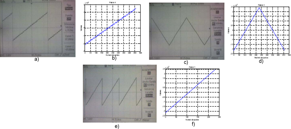 Figure 5 shows three different patterns generated with the microcontroller dsPIC and converted by the DAC PCM69AP. The patterns were computed first in LabView®, after in the dsPIC30F6014 a program with the commands to generate the patterns were computed; finally the output voltage from PCM69AP was registered by the ADC of the microcontroller and shown in an interface.