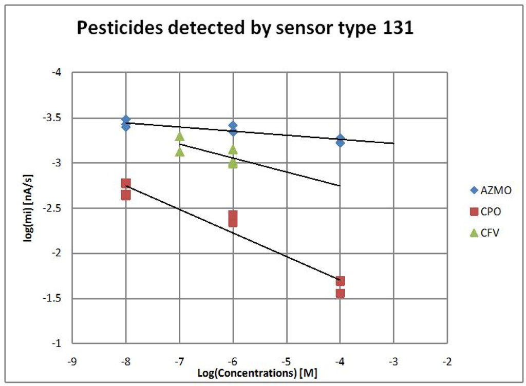 As a final test, the complete system was used to detect three organophosphorus insecticides: chlorpyrifos-Oxon (CPO), chlorfenvinfos (CFV), azinphos methyl-oxon (AZMO) using a screen-printed enzymatic biosensor based on genetically-modified B131enzyme.