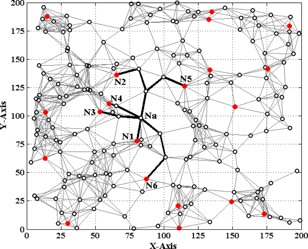 If d′ai is accurate, solving (1) can obtain the true value of Na’s coordinates Xa = [xa, ya]T. However, due to ranging errors and approximations of multi-hop distances, d′ai suffers from certain uncertainty which directly leads to the localization errors of sensor nodes. Especially in anisotropic networks, the shortest paths between pairs of non-neighboring nodes may be distorted by concave area and deviate far away from the Euclidean distances (e.g., the shortest path Pa1 between Na and N1 shown in Figure 2). In this case, approximating the lengths of shortest paths to Euclidean distances would give rise to erroneous localization results. How to mitigate the influence of irregular network topology on node localization and improve the localization accuracy is one topic of our study.