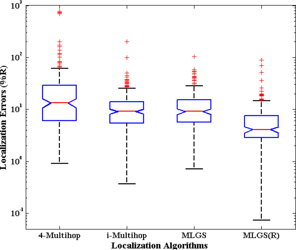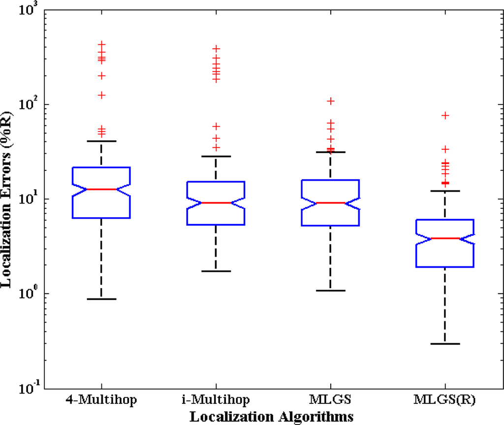 First, we analyze the distribution of node localization errors in the default environments. The localization errors are represented by the ratio of the Euclidean distances between estimated coordinates and actual coordinates to node’s communication radius. Figures 10 and 11 present the distribution boxplots for isotropic and anisotropic networks, respectively. The y-axis of both figures is drawn in log-scale. In isotropic network, 4-Multihop gives the worst performance. Its average and median errors are respectively 23.24% and 13.36%, and its maximum outlier is even close to 800%. The average and median errors of i-Multihop are almost the same as those of MLGS. But the errors of i-Multihop are more scattered. The maximum outlier of i-Multihop reaches 200.50% (compared with 103.29% of MLGS). MLGS(R) has an average error of 7.17% and a median error of 4.08%, which is a significant improvement in localization accuracy. In anisotropic network, 4-Multihop is less affected by irregular shape because it only uses the four nearest anchor nodes in calculating the coordinates of normal nodes. Compared with Figure 10, we can see that the accuracy of i-Multihop declines vastly. The average error of i-Multihop reaches 21.67%, but it is still lower than that of 4-Multihop (26.53%). MLGS and MLGS(R) are robust to irregular topologies. Their average errors, median errors and maximum outliers in anisotropic network are almost the same as those in isotropic network, and much smaller than those of 4-Multihop and i-Multihop.