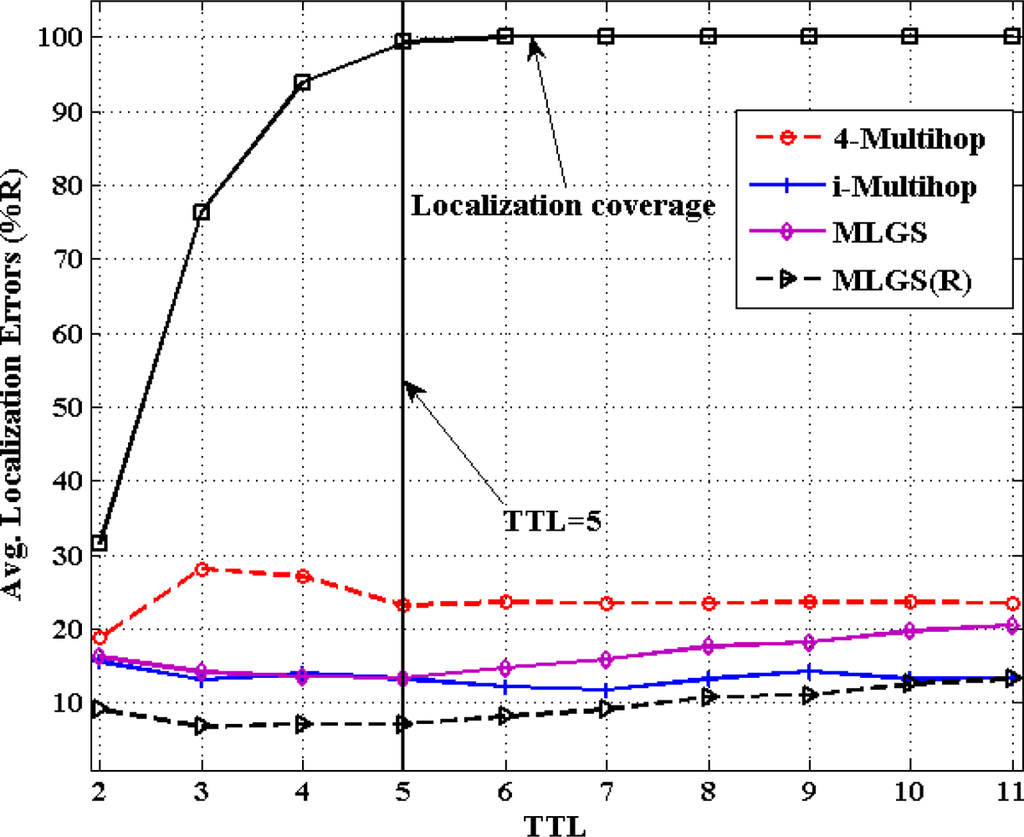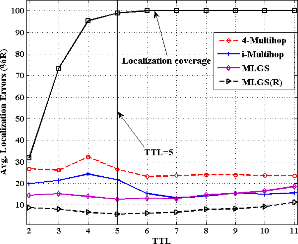In isotropic network, 4-Multihop performs the worst. Its average error varies significantly when TTL ≤ 5 and remains generally stable (about 23%) after TTL > 5. The localization accuracies of MLGS, MLGS(R) and i-Multihop are less affected by TTL and are always better than that of 4-Multihop. Among them, MLGS(R) gives the smallest localization error of about 10%. Through the accuracy of i-Multihop slightly exceeds that of MLGS when TTL ≥ 6, but it is always lower than that of MLGS(R). In anisotropic network, 4-Multihop still has the lowest accuracy. i-Multihop is greatly affected by irregular network, and its average error is about 5% higher than that of MLGS when TTL ≤ 5. With the increase of TTL, the number of distance constraints in i-Multihop rises, and the accuracy of i-Multihop is gradually near to that of MLGS. Through refinement, MLGS(R) can increase the localization accuracy by more than 5%. And in most cases, its average error is less than 10% of the communication radius of sensor nodes.