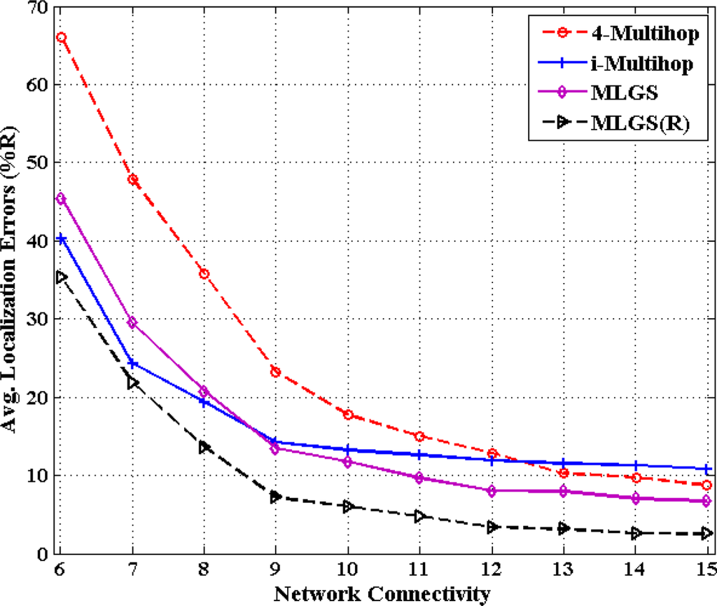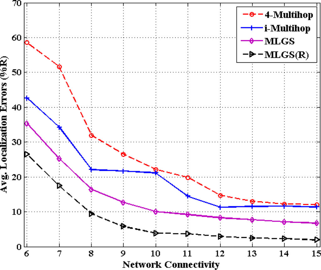 In this part, we vary the communication radius of sensor nodes and get the accuracy comparisons of four algorithms under different network connectivity, ranging from 6 to 15 (see Figures 14 and 15). In general, the probability that a shortest path between pairwise nodes is close to a straight line grows as network connectivity increases, which directly results in the improvement of multi-hop localization accuracy. In isotropic network, the performance of MLGS(R) is better than those of three other algorithms. It gives an average error of less than 3.5% for high network connectivity (no less than 12). When network connectivity is smaller than 9, the accuracy of i-Multihop is higher than that of MLGS. However, the average localization error of i-Multihop gradually converges to about 11% and exceeds those of MLGS and 4-Multihop. In anisotropic network, the variation trend of average localization errors of four algorithms is similar to that in isotropic network, but the gap among the four algorithms becomes more evident. The localization accuracies of MLGS and MLGS(R) are always better than those of i-Multihop and 4-Multihop. When network connectivity is 6, the average error of MLGS is less than 40%, above which the localization error will significantly affect the application performance of WSNs [25]. When network connectivity reaches 10, the average error of MLGS is below 10% and it can be further reduced to less than 5% through refinement, while the two other algorithms give larger average errors of more than 20%.