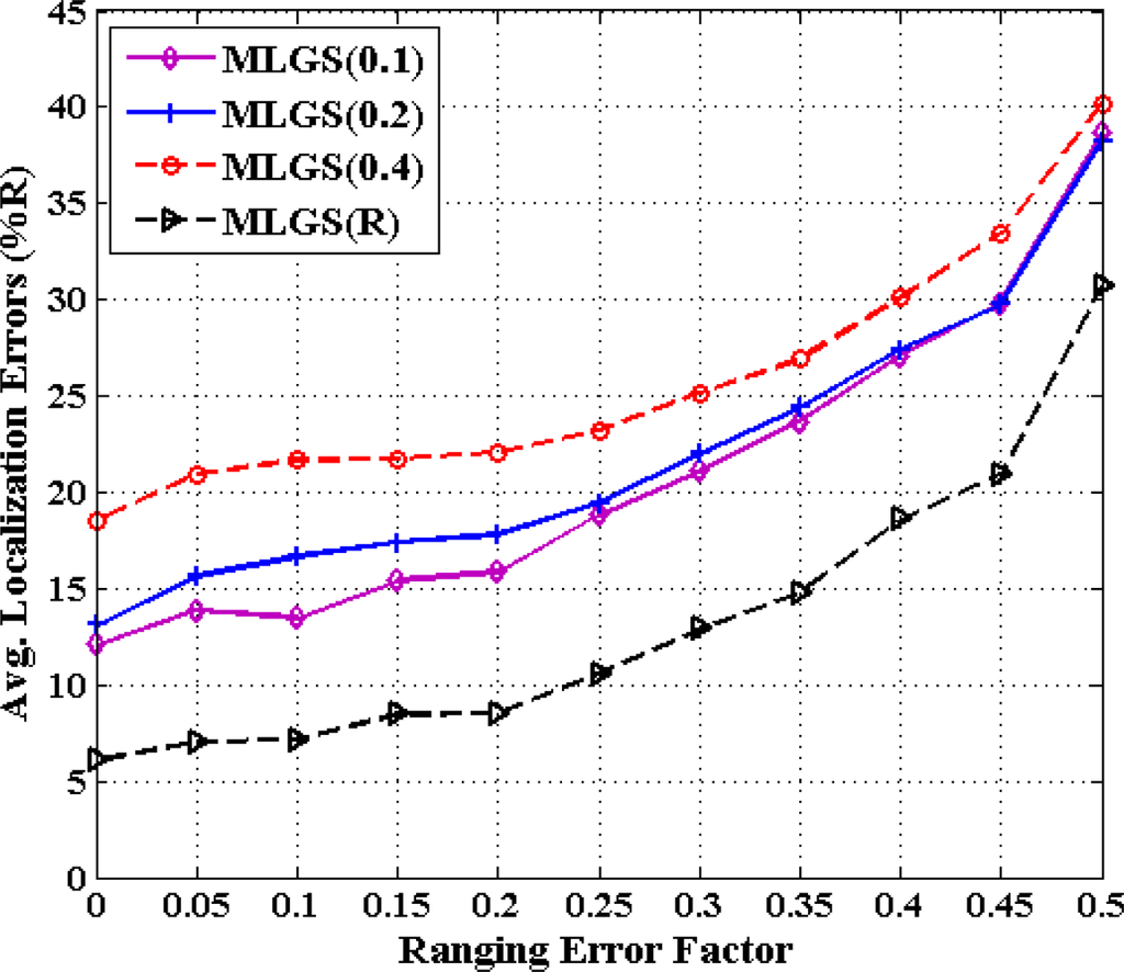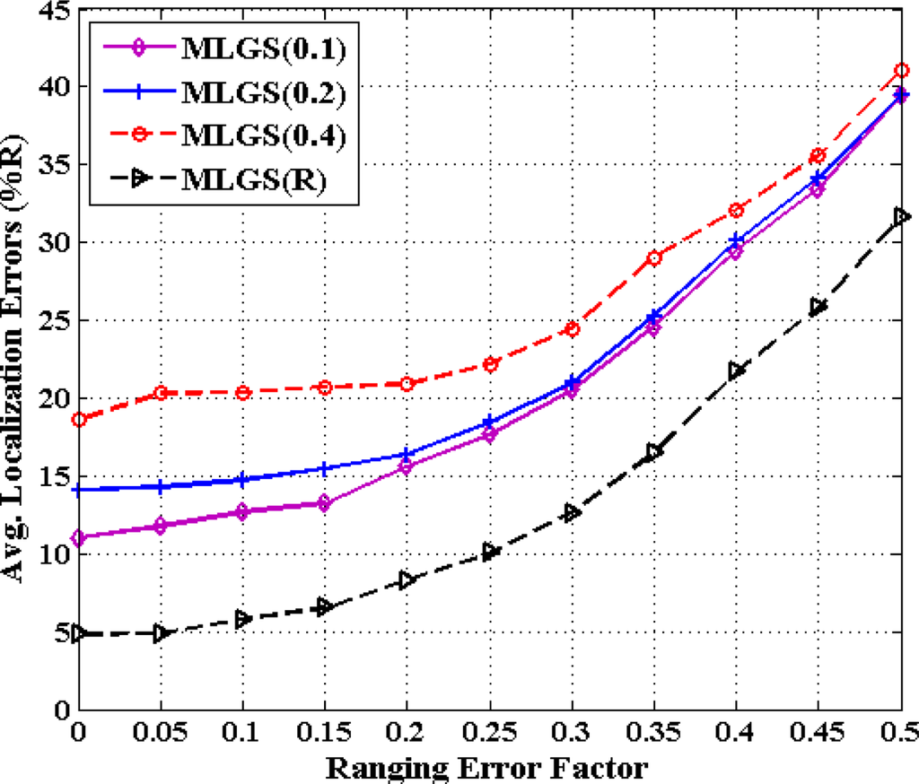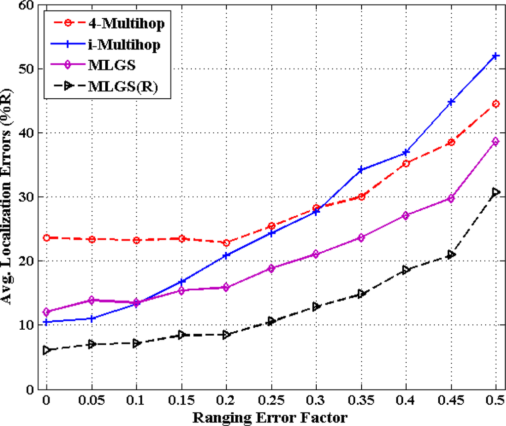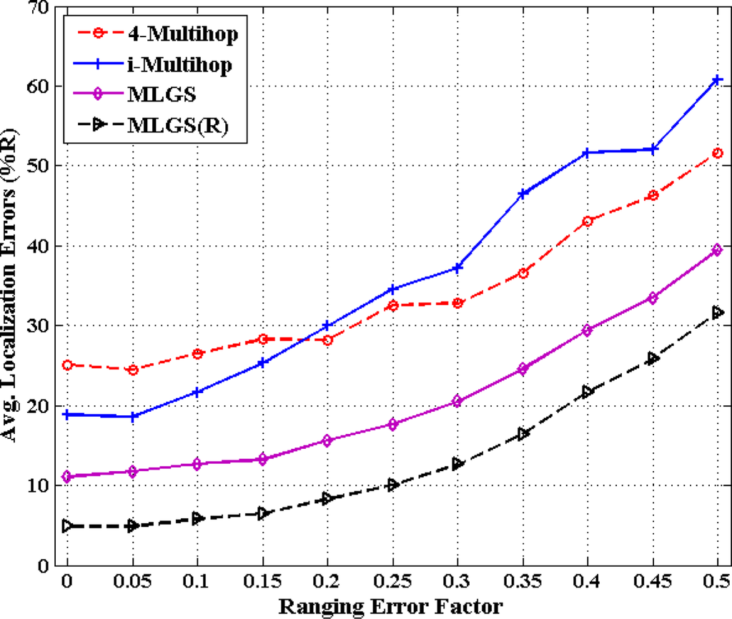 As can be seen from Figure 16, we can infer that MLGS and MLGS(R) are robust with respect to high ranging errors. When α increases to 0.5, the average localization error of MLGS is still smaller than 40% of node’s communication radius. Through refinement, the average error can be further reduced to 30%. In anisotropic network, MLGS and MLGS(R) perform consistently better than 4-Multihop and i-Multihop under all ranging error factors considered. Compared with the latter two algorithms, MLGS can improve localization accuracy by 10%∼20%, and further increase by 5% after refinement. When α = 0.25, the average errors of 4-Multihop and i-Multihop are more than 30%, while those of MLGS and MLGS(R) are only less than 18%.