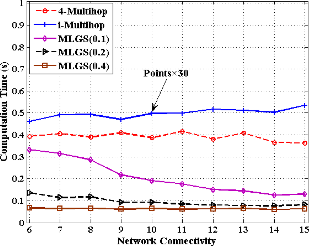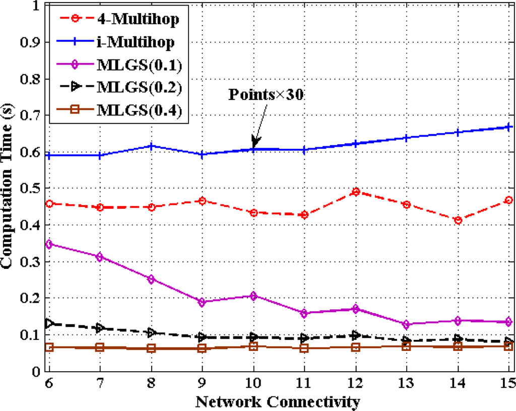 However, with the increase of network connectivity, MLGS(0.1) performs faster and faster, while 4-Multihop keeps a constant computation time. That is because higher network connectivity would enhance the constraints of sensor nodes and diminish the feasible regions of normal nodes in MLGS. For MLGS, reducing grid granularity g could lower the computation cost evidently in sparse networks. For example, in isotropic network with connectivity of 6, the computation time of MLGS(0.1) is 0.33 s, that of MLGS(0.2) is 0.14 s and that of MLGS(0.4) is only 0.06 s. But in networks with high connectivity, with the increase of g, the variety of computation cost is not so obvious. When network connectivity reaches 10, the computation cost of MLGS in different g drops to below 0.2 s. It is worth noting that MLGS(0.2) and MLGS(0.4) nearly have a constant computation time in various network connectivity.
