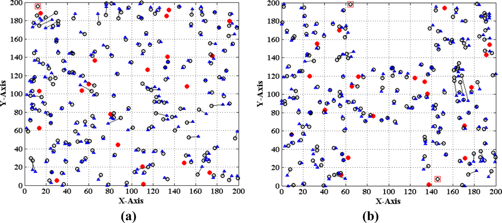 Finally, we evaluate the performance of the MLGS by comparing it with MDS-MAP [7] and the improved iterative algorithm with error control mechanism similar to [14]. The comparison results are shown in Figures 22–24, in which the circles represent true positions of nodes (solid circles for anchor nodes and empty circles for normal nodes), the triangles represent estimation positions of normal nodes, and the lines represent localization errors. For MLGS and Iterative algorithms, if a normal node can’t get enough reference information to computing its coordinates, a square will be drawn around it. Table 2 gives the average localization errors of three algorithms in isotropic and anisotropic networks.