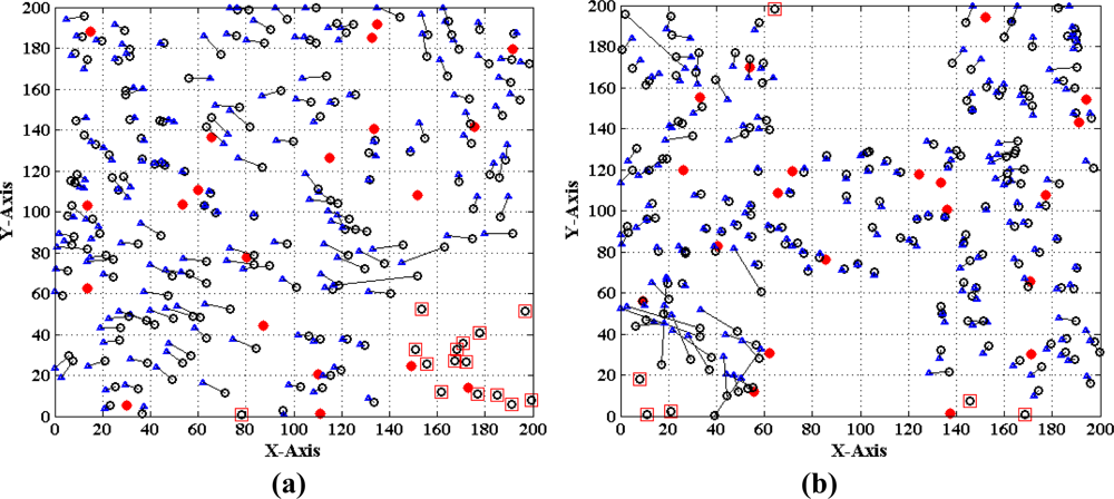 ’ and hollow dots ‘○’ represent anchor nodes and normal nodes, respectively. In Figure 1, all nodes are randomly scattered in a 200 × 200 square area to form an isotropic network, while all nodes in Figure 2 are deployed in an H-shaped area to form an anisotropic network. In practice, the anisotropic characteristic results from certain unavoidable reasons, such as non-convex deployment region, node failure or movement, different node densities, obstacle interfering, etc. A typical example of anisotropic network is that WSNs are deployed in streets of urban areas where nodes may be separated from each other by buildings, which results in H-shape topology. Without loss of generality, we consider a network consisting of m anchor nodes and n normal nodes. The identities (IDs) of anchor nodes are from 1 to m and those of normal nodes are from m + 1 to m + n. Each node’s communication and ranging radius is R. The network graph can be defined as G = (Vm ∪ Vn, E), where Vm and Vn are respectively anchor node set and normal node set. E is measurable distance set of all pairs of neighboring vertexes (i, j), i, j ∈ Vm ∪ Vn. The objective of WSNs localization is to recover the coordinates of the vertexes in normal node set Vn under the constraints of edge set E and anchor node set Vn. The coordinates of node Np can be described by Xp = [xp, yp]T. The Euclidean distance from Np to its neighbor Nq is dpq = ‖Xp–Xq‖2. The corresponding measurable distance is d′pq = dpq + ɛpq, where the ranging error ɛpq ∈ (−αdpq, αdpq). The ranging error factor α reflects the ranging capability of sensor nodes.