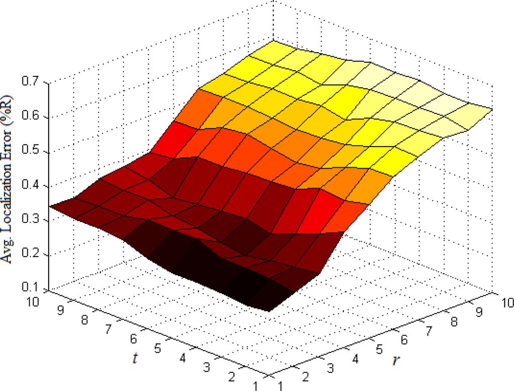 The base number in the third part of Equation (5) represents the ratio of all nodes’ average density to the target node’s local density. In most cases, Equation (5) could satisfy the requirement that the weight wai of multi-hop reference information is no more than 1. If extreme case of wai > 1 appears, we set wai = 1. To determine the optimal values of indexes r and t, we have done numerous simulations in various network environments. The results show that we could usually get more ideal localization accuracy when both r and t are set to 1. Taking the scenarios shown in Figures 1 and 2 as examples, we vary r and t from 1 to 10 and use classical weighted least squares estimator to compute the coordinates of normal nodes. The average localization errors in both scenarios are shown in Figures 5 and 6, respectively.