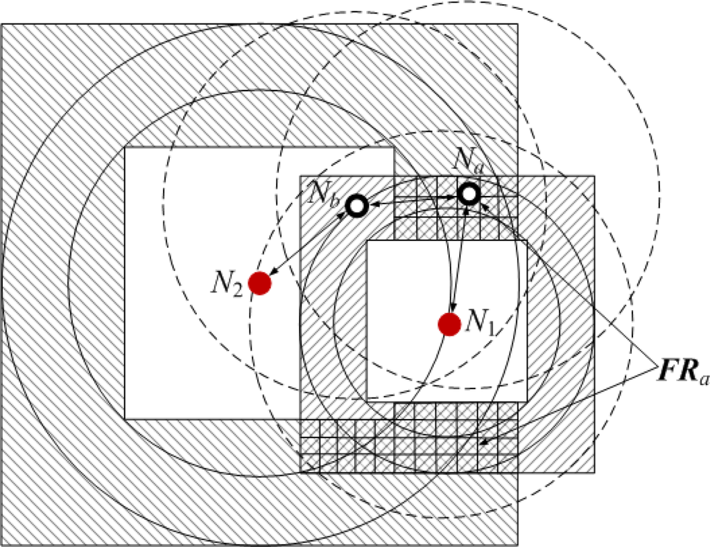Figure 8 is the integration of Figure 7(a,b). When Na gets all its bounding square rings BSRai(i = 1, 2,⋯, K), its feasible region FRa (grid area) can be obtained by calculating the intersection of bounding square rings: