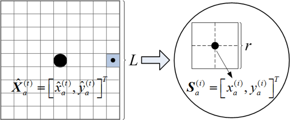 Step 2. The grid-scanning scheme can also be used to seek the close to optimal value of model (13). As can be seen from Figure 9, a square of which the center coordinates and the size length are respectively and L (generally no more than R) is regarded as Na’s feasible region for localization refinement, and it is denote as: