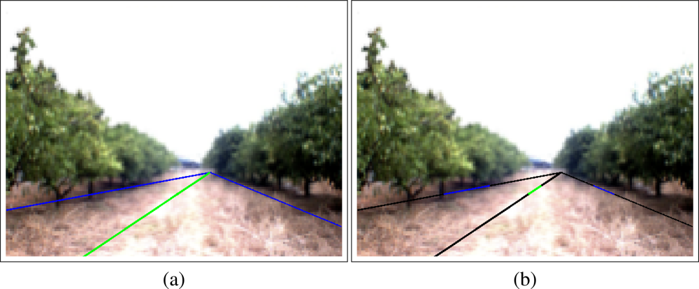 Finally, the borders of the grove are represented by the section of these lines located “under” their intersection, (xi, yi), as shown in Figure 7. These sections correspond to those points of the lines whose values of x and y are inside the image and whose y-value is higher than yi.