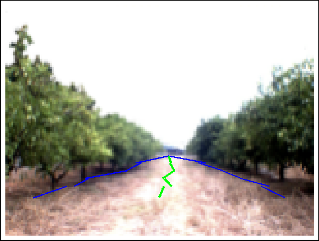 With the filtered classification image, the path can be determined by detecting the main lines between the land and each orange tree row.
