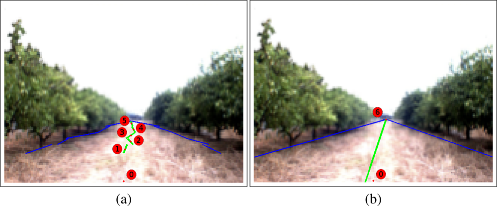 In agricultural robotics, as in other mobile robotic systems, one of the most important parts is the navigation module. This part of the system is in charge of determining the optimal path the robot must follow in order to successfully perform a task (i.e., spraying or weed detection). For instance, this path is located between two orange tree lines in the case of a robotic system which navigates into an orange grove.