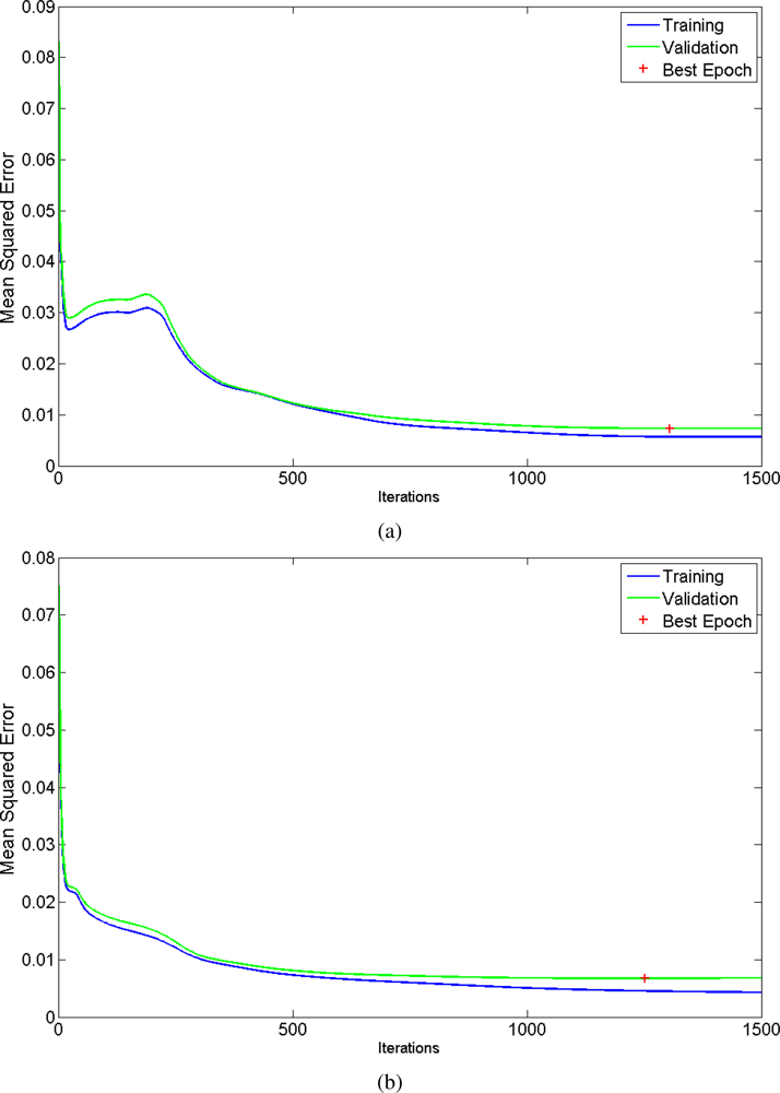 The generated ensembles have been tested with some captures in order to test the sensory system in path planning. First of all, the training curve of two networks of the generated ensemble are depicted in Figure 14. The green lines denote the Mean Squared Error calculated with the patterns of the validation set. Similarly, the blue lines correspond to the MSE related to the training patterns. The best epoch, the one used to select the final parameters of the network, is denoted with the red cross.