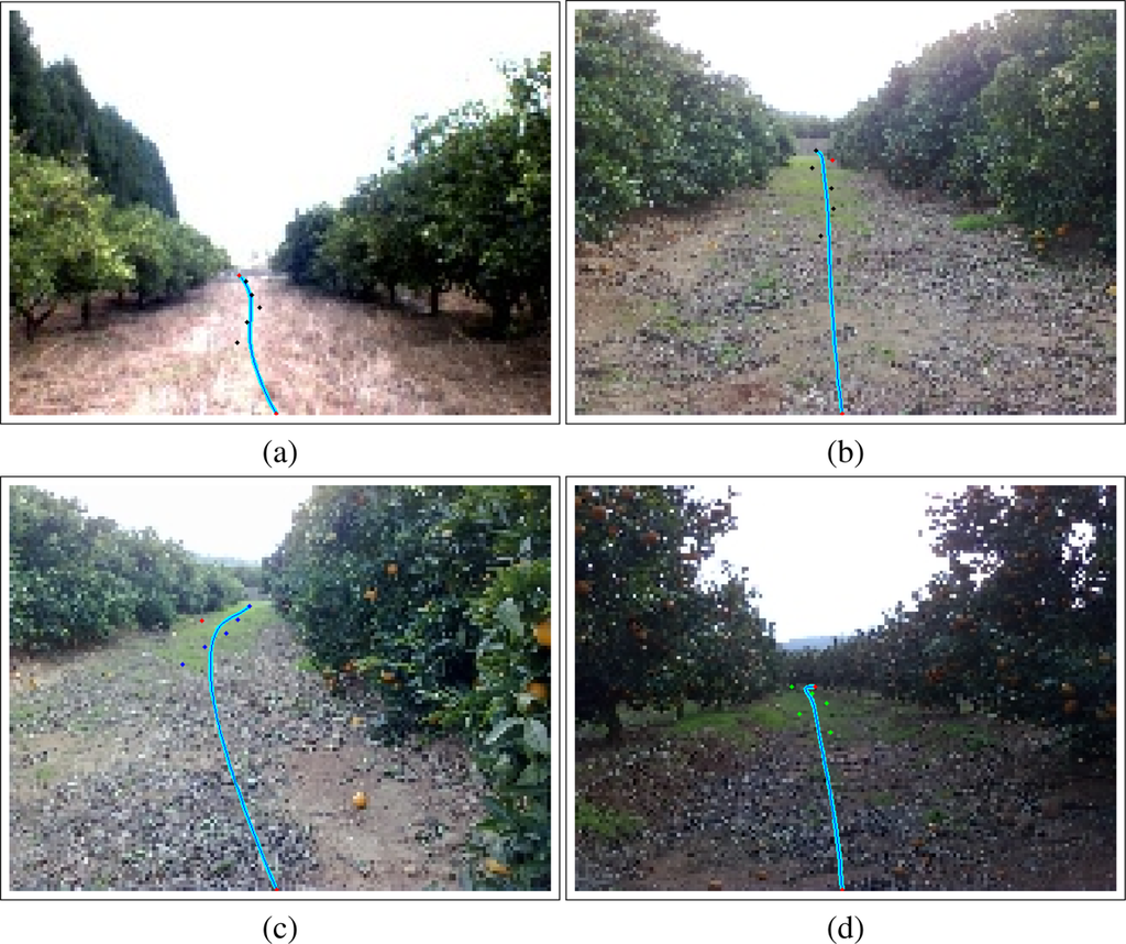Then, Figure 15 shows four captures with the desired path (by which the robot should navigate) drawn on it. These images were taken in different groves with different environmental (lighting and weather) and positional conditions.