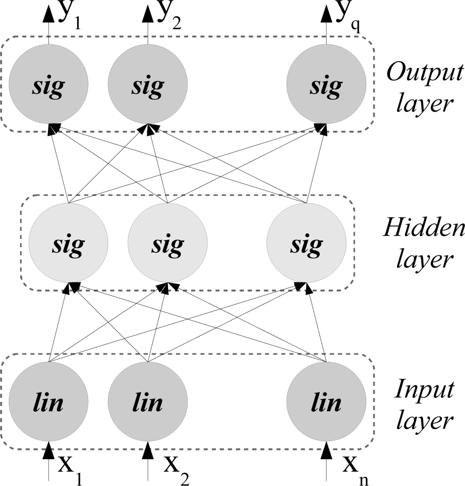 For the input layer, the input values, ii, and the output values, io, correspond to the value of the input parameters because the identity transfer function is applied in the input layer units.