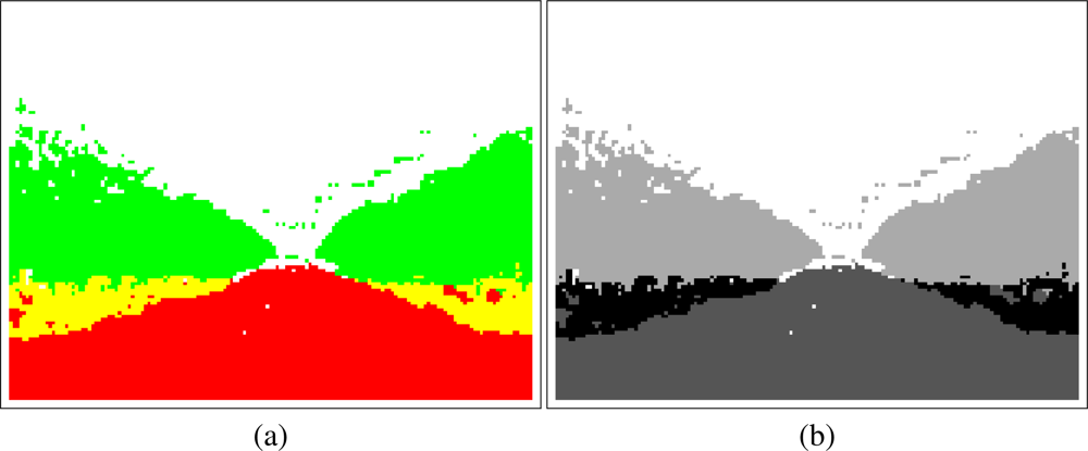 In the classification image [Figure 3(a)] the colors are organized as follows: red refers to Land/Soil, white is Sky, green is Orange crown and yellow refers to the area of Orange trunk. It can be seen in the example that the classification is accurate and the important areas are correctly classified. Moreover, the basic structure of the orange grove can be easily seen in the classification image. Although this classification image is representative for humans, the procedures used to calculate the desired path required a gray scale image [Figure 3(b)].