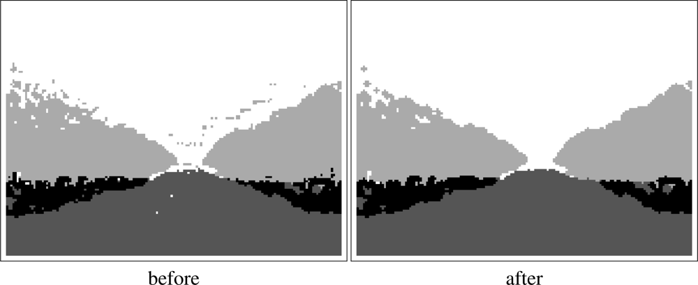 Then, an erode/dilate filter is used to remove small wrong areas. With this procedure, some errors which were not removed with the previous filter are now eliminated from the classification image. Moreover, the filter to eliminate all the isolated blocks can be applied again after the erode/dilate processing. An example of the classification image before and after the filtering is shown in Figure 4.